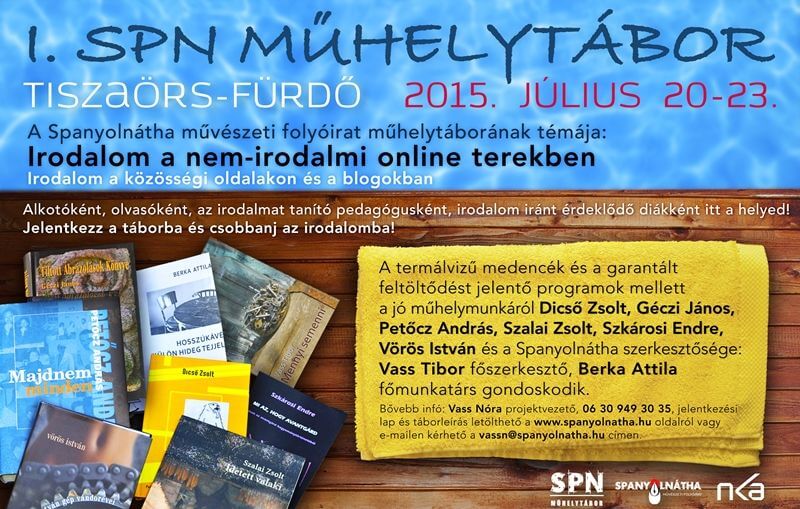 Irodalom a nem-irodalmi online terekben — Irodalom a közösségi oldalakon, a blogokban címmel rendezi műhelytáborát a Spanyolnátha művészeti folyóirat július 20. és 23. között Tiszaörs-fürdőn. A táborlakók a folyóirathoz kötődő szerzők workshop-jellegű, kiselőadásokkal egybekötött foglalkozásainak lehetnek aktív közreműködői.