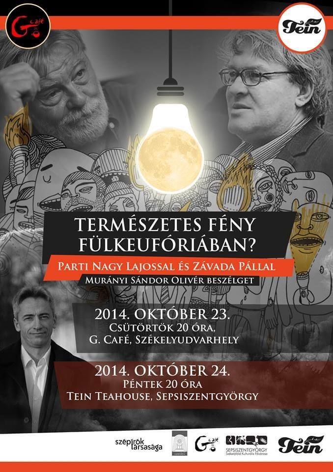 A szerzőpárossal Murányi Sándor Olivér író beszélget október 23-án, csütörtökön 20 órától a székelyudvarhelyi G. Caféban, október 24-én, pénteken 20 órától pedig a sepsiszentgyörgyi Tein Teahouse-ban. A rendezvény támogatói a Szépírók Társasága, a G. Kulturális Egyesület, a Gondűző Étterem és Szálloda, Sepsiszentgyörgy Polgármesteri Hivatala és a Tein Teahouse. Mindenkit szeretettel várnak.