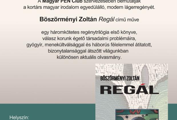 A Magyar PEN Club szervezésében bemutatják a kortárs magyar irodalom egyedülálló, modern lágerregényét. Böszörményi Zoltán Regál című műve egy háromkötetes regénytrilógia első könyve, válasz korunk égető társadalmi problémáira, gyógyír, menekültválsággal és háborús félelemmel átitatott, bizonytalansággal átszőtt világunkban különösen aktuális olvasmány.