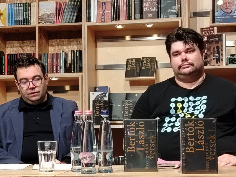 A pódiumon Mohácsi Balázs költő-szerkesztő, a könyv összeállítója beszélgetett Szegő Jánossal, és Bertók verseit Pataki Ferenc színész szólaltatta meg. A beszélgetést azzal kezdték, hogy a könyv anyagának összeállítása nagy munka volt, mely során Mohácsi az eddig megjelent kötetek mellett hagyatéki anyagokból, füzetekből és számítógépes mappákból is dolgozott. Például talált egy „Korai versek” és egy „Elfuserált versek” című mappát is. Kiderült, hogy az „elfuserált versek” nem is voltak olyan elfuseráltak, így Mohácsi azokat is betette a kötetbe, mely így „teljes portét ad”. Bertók egyébként „kényszeresen megtartott mindent”, így történhetett, hogy a PIM összesen 30 dobozban őrzi írói hagyatékát. Bertók „az utókornak dolgozott”.