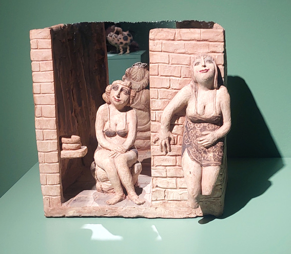 Csoportos női figurák, finoman stilizált, egymás mellett álló testek (Amszterdami lányok – 1980, agyag, oxidok, tükör). A pozíciók ritmusa és a testközelség a társasági interakciót érzékelteti. A lágy groteszk a női társaság és önállóság érzékeltetésére szolgál. A humor és az irónia finom: a figurák testbeszéde a társadalmi szabályokról, a konvenciók kényszeréről árulkodik.