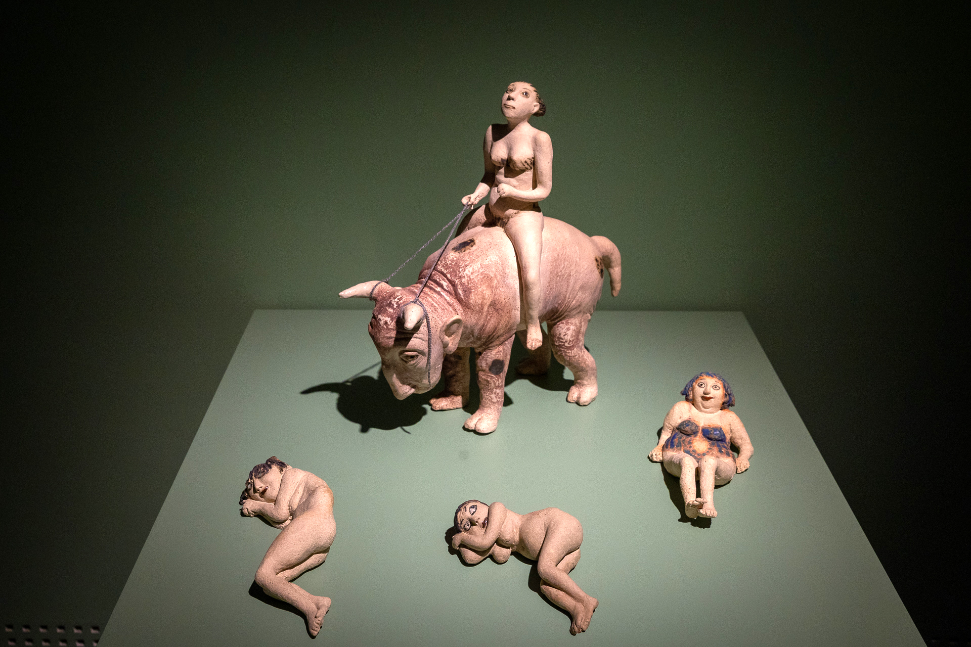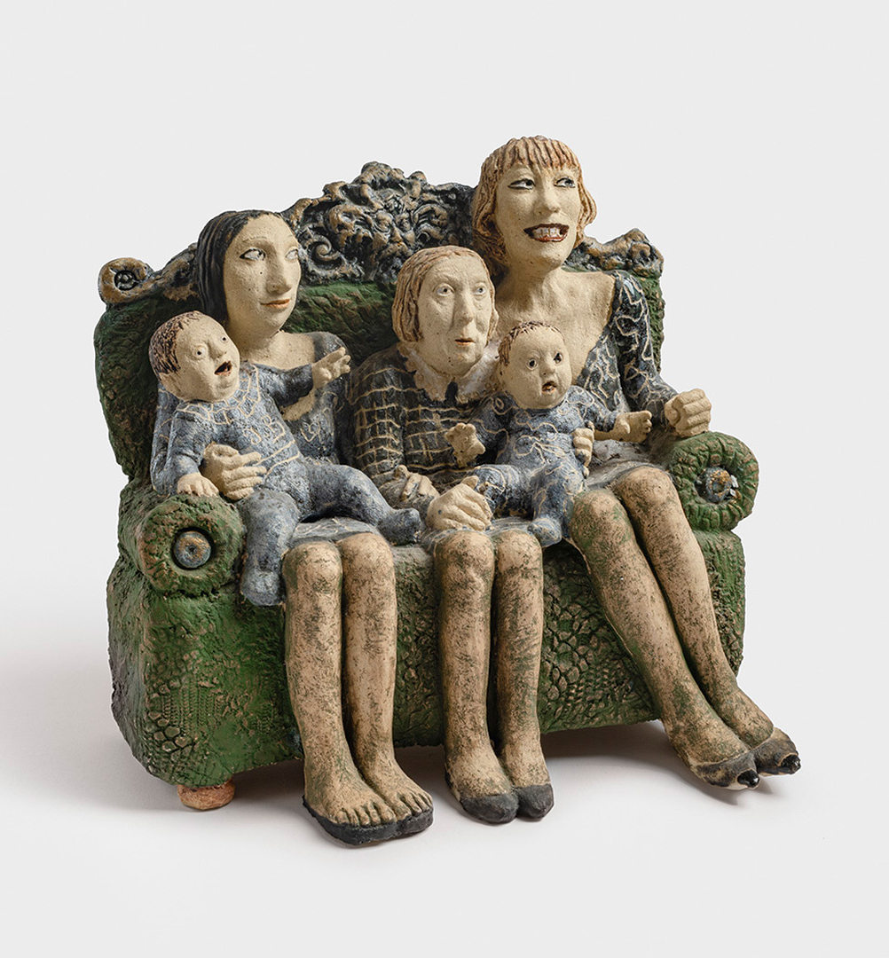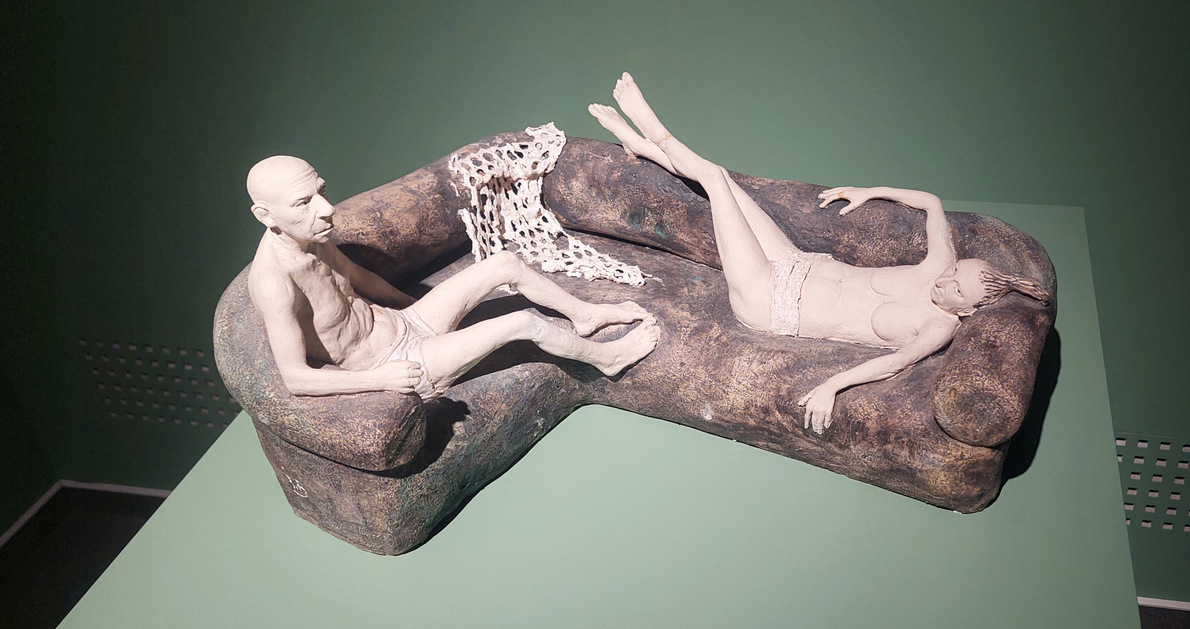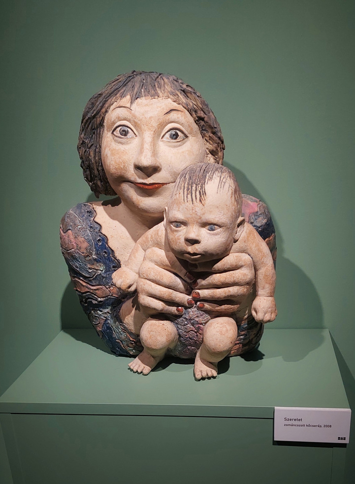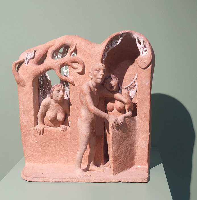 A testek gyakran meztelenek, de nem erotikusak. A pőreség itt nem a vágy, hanem a kiszolgáltatottság nyelve. A ráncok, a túlsúly, a törékenység nem torzítás, hanem realitás. És mégis: ezek a testek hordozzák a szépség utáni vágyat is. A groteszk nem rombolja, hanem újradefiniálja a szépséget. A kövérség, soványság vagy görbületek enyhe torzulása egyszerre nevettet és azonosulásra késztet, a groteszk humor az empátia eszköze. A test hordozza a társadalmi és személyes autonómiát, olykor a játékos és szatirikus gesztusok révén (Szerelmi háromszög – 1988, kőcserép). A női figurák különösen erősek. Nem dekoratívak, nem alárendeltek. Jelen vannak.