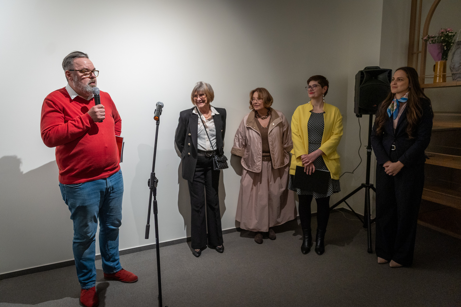 A megnyitó kontextusa tovább árnyalta ezt az értelmezési mezőt. L. Simon László intézményi keretet adott a tárlatnak, míg Szilágyi Enikő színművész performatív hangsúlyt vitt az eseménybe. Dr. Bordás Beáta megnyitója a művek mögötti kulturális és történeti tapasztalatra világított rá, kiemelve a groteszk, mint értelmezési kulcs jelentőségét.
