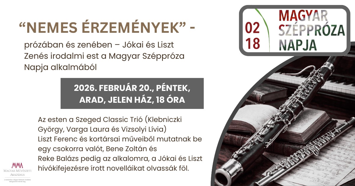 „Nemes érzemények” prózában és zenében – Jókai és Liszt című rendezvényével zárta a Jókai-bicentenáriumot a Magyar Írószövetség Csongrád-Csanád vármegyei írócsoportja, az Areión Kulturális Egyesület és a Magyar Művészeti Akadémia Szegedi Regionális Műhelye. Az estet február 20-án Aradon, 25-én Szegeden láthatta és hallhatta a közönség. A két eseményen Bene Zoltán József Attila-díjas író és Reke Balázs Móricz Zsigmond-ösztöndíjas író, filmesztéta kifejezetten erre az alkalomra írott Jókai-inspirációi mellett Liszt Ferenc művei hangzottak el a Szeged Classic Trio (Varga Laura fuvolaművész, Klebniczki György zongoraművész és Vizsolyi Lívia fagottművész) tolmácsolásában.
