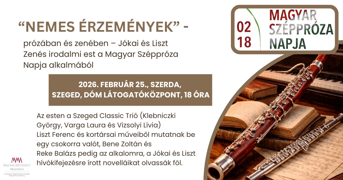 „Nemes érzemények” prózában és zenében – Jókai és Liszt című rendezvényével zárta a Jókai-bicentenáriumot a Magyar Írószövetség Csongrád-Csanád vármegyei írócsoportja, az Areión Kulturális Egyesület és a Magyar Művészeti Akadémia Szegedi Regionális Műhelye. Az estet február 20-án Aradon, 25-én Szegeden láthatta és hallhatta a közönség. A két eseményen Bene Zoltán József Attila-díjas író és Reke Balázs Móricz Zsigmond-ösztöndíjas író, filmesztéta kifejezetten erre az alkalomra írott Jókai-inspirációi mellett Liszt Ferenc művei hangzottak el a Szeged Classic Trio (Varga Laura fuvolaművész, Klebniczki György zongoraművész és Vizsolyi Lívia fagottművész) tolmácsolásában.