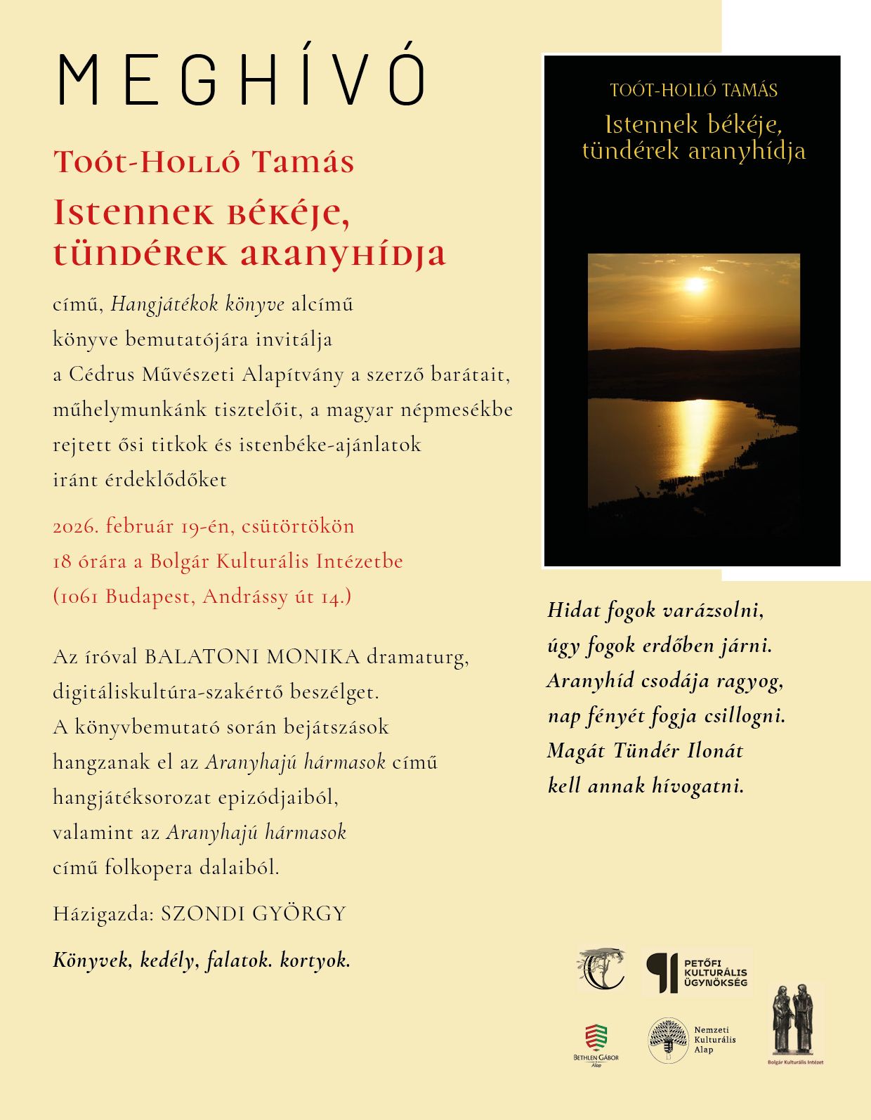 A könyvbemutatót 2026. február 19-én, csütörtökön 18 órától rendezik a Bolgár Kulturális Intézetben (1061 Budapest, Andrássy út 14.)