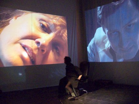 A darab szereplőit a folpack-ba csomagolt irodai széket trapézalakban határoló három vetítővásznon a részletekig megtervezett, a valódi, egyidejű párbeszéd illúzióját megteremtő film jelenítette meg. Hamlet őrülete így ismét egy réteggel gazdagodott, hiszen az egyes snitteken feltűnő alakok a jelenlét illúzióját keltve, de valójában éppen jelen-nem-létükkel hangsúlyozták a képkockákkal monologizáló kiszolgáltatottságát. A modern Hamlet időben és térben valódinak látszó, de a valós érintkezésről lekéső párbeszédet folytatott, akár a tévéképernyő előtt ülő modern hamletek. Nem irányíthatta a dialógusokat, mert a vászon gyakran kifehéredett egy-egy monológ közben, magára hagyva a királyfit.
