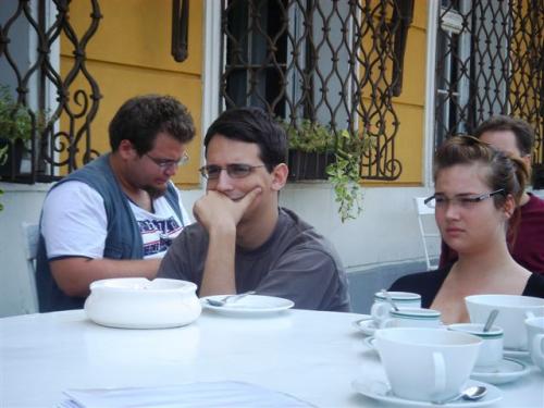 időpont. János nagy formában. Mindenkit hagy érvényesülni, biztat a hozzászólásokra, a végén összegez, abszolúte segítő szándékkal. (Bár azt hallom, hogy Darvasi, és Egressy is hasonlóképp jó szemináriumot tart.) Ebéd után tele hassal Márton László előadását hallgatom, kortárs dráma. Öt percünk van utána, hogy lerongyoljunk a strandra, megfürödjünk, és beüljünk az olvasóliget felolvasására. A mikrofonok mögött Garaczi László, és Csaplár Vilmos. A hallgatóság első soraiban a strandról beesett lánykák, akik Garaczi szövege hallatán menekülőre fognák a dolgot, de kínos lenne felállni. Interaktívvá válik Csaplár, mikor hátul egy kisgyerek hisztizik fagyiért, vagy mikor megérkezik Konrád György, azt csak remélem, hogy nem hallja, mikor az egyik pultosnő átordít a másiknak: Manci! Neked van még jegeskávéd?