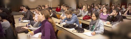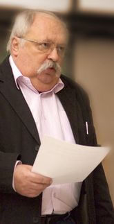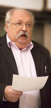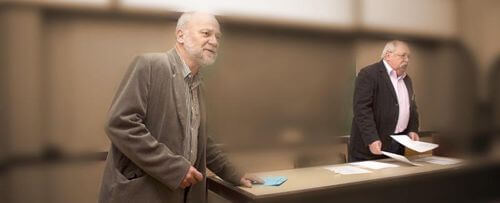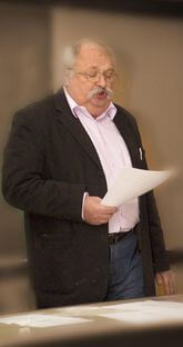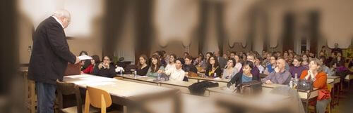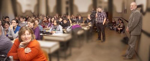 22 órakor a terem már tele, a hallgatóság soraiban főként diákok, de jelen vannak a helyi értelmiség örökmozgói is, középiskolai és egyetemi tanárok, zsurnaliszták. Az utolsók között egy fiatal pár érkezik babakocsival, aztán egy cowboy kalapos fiú, kezében kamera, nyilván az Egyetem TV egyik munkatársa, mozgolódás, halk nyüzsgés, a bejáratnál eddig energiaitalt osztó csinos hostess lányok éppen távozni készülnek. Megérkezik Géczi János a rendezvénysorozat létrehozója és vele az előadó, kinek a házigazda át is adja a szót, mondván őt nem kell bemutatnia a hallgatóságnak, hiszen mindenki ismeri. Dr. Kovács Árpád ugyanis a Pannon Egyetem Magyar Irodalomtudományi Tanszékének megalapítója, aki 2002 és 2008 között a Tanszék vezetője. Amit itt Veszprémben talán a legtöbben tudnak róla, hogy a tanszéken megrendezett Veszprémi Regénykollokviumok és a belőlük született tanulmánykötetetek egyaránt az ő nevéhez köthetőek. A magyar és a nemzetközi tudományos élet a XIX. századi orosz irodalom és az irodalomelmélet iskolateremtő tudósegyéniségeként tartja számon, jól ismertek az Arany János, Kosztolányi költészetét értelmező tanulmányai, az utóbbi években pedig József Attila poétikájával foglakozó publikációi láttak napvilágot. Kovács Árpád jelenleg a Károli Gáspár Református Egyetem Bölcsészettudományi Karán működő Irodalomtudományi Doktori Iskola vezetője, de tanít az ELTE BTK Magyar Irodalom- és Kultúratudományi Intézetében is. 1994-től 2008-ig az ELTE Orosz irodalom és irodalomkutatás doktori programjának vezetője volt. Tanári tevékenységét tehát nem hagyta abba, de ebben a teremben, ahol évekig tartotta előadásait, most vendégprofesszor. Mai előadásának központi témája, hogyan juthatunk el a poétika szűken vett fogalmától Arisztotelész segítségével odáig, hogy az emberről szerzett ismereteinket alapozzuk meg.
