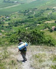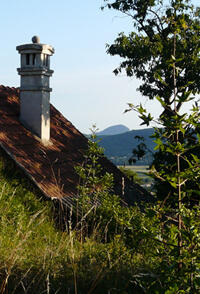 Azt hittük, ezzel mára vége a mutatványoknak, de Szentbékkálla határa ritka izgalmas terep: először is vannak régi, elhagyatott kőház maradványok, közvetlenül az út mellett, ezekre Réka mászott föl, hogy megnézze őket. Utána remetét találtunk, róla kiderült, hogy valami művész. (Elhatárolódunk.) Igen barátságos volt, szerette volna, ha bemenjünk. Meg is fürödhetünk nála, sőt, aludjunk ott. Ja, hát ingyen persze. "Köszönjük, de van szállásunk." "De hát nyugodtan jöjjünk, jó lesz ez!" Nem mentünk, úgyhogy megsértődött, én meg bosszúból lefotóztam a kapuját (őt nem tudtam, mert elfutott).
