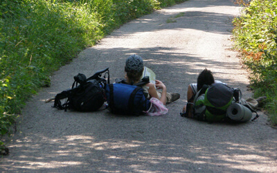 Amíg beértünk a városba, nem is nagyon szólt senki. Ott aztán szépen elkerültük egymást Rékával. Ő még nagyon friss volt, elindult az apátságba szétnézni, úgyhogy végül is mi vártuk be őt a buszmegállónál, innen már négyesben mentünk a vendégházhoz, Piros jelzésen, a műúton. Ott még azért külön mutatvány volt bejutni, mert végigzörgettük a jó hosszú ház szinte minden ablakát, mire észrevettek, utána viszont kaptunk egy jó kis szobát a fürdőköpenyes nőtől, aki ajtót nyitott, és végre nyugton kipusztulhattunk. Kemény nap volt a mai, de most visszanyertük a Makkoshotykánál elvesztett időt, és ezután visszatért minden az eredeti kerékvágásba.