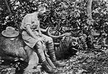 A legújabb bivalynyomokat követve, egy mézmadár (Indicator indicator) csatlakozott hozzám és fecsegésétől ugyancsak hangot lett a jungle. Próbáltam elhajtani a zajongót, de azzal csak azt értem el, hogy a gonosz madár még idegesebben, még hangosabban hívott a méhek fészkéhez. A méhmadár csevegésétől figyelmeztetve fölpattant fekvőhelyéről egy bivalybika és magasan föltartott fejjel az indicator hangjára figyelt. Jó, hogy idejekorán észrevettem! Bár szemközt néző bivalynál nem szeretem a fejlövést, itt nem volt más tennem, mint a homloka közepét – közvetlen a szarv pereme alatt – célba venni és tüzelni.