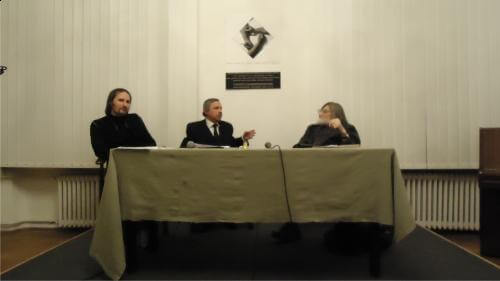 Zsille Gábor felolvas a “könyvtárosról”. Nem tudom, hogyan lehet szépen megemlékezni egy alkotóról. Nem tudom, hogyan lehet “megidézni” a szellemét. De az biztos, hogy a műveivel szinte óhatatlanul elénk tűnik az alakja, és maivá válnak a gondolatai. Zsille Gábor felolvasását jó hallgatni. Van benne valami közösség-érzet és valamiféle játékos tisztelet is. Érezhetően érti és érzi Hamvas Béla sorait. Az est három pontján történik meg ez az “utaztató” mozzanat, amiben az irodalom és a szellem még a terem fűtetlen huzatosságát is feledtetni tudja. De. Ha lehetne csak kérdőmondatokkal írni egy cikket, akkor, azt hiszem, örömmel illeszteném a kacskaringózó írásjeleket a következő mondataim végére. Mégis (olykor) megpróbálkozom a pontokkal. Igazából nem tudom, van-e olyan, hogy az “est moderator” kézikönyv. Amolyan íratlan formula. Igazából nem is hiszem, hogy kellene lennie.