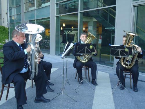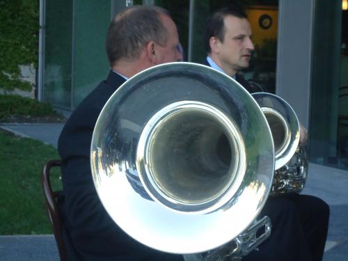 A megnyitó záróakkordjaként érkeztek meg a városi csúcsforgalomban elakadt, de végül boldogan hangszerükbe fújó tubások: a The Heavy Brass Guys nevű vidám formációt Hanne Tornoe asszony, a Dán Kulturális Intézet vezetője köszöntötte, valamint ajánlotta a Román Kulturális Intézetben aznap megnyíló hat dán képzőművész kiállítását. A tubakvartettet alkotó négy „keményfiú” dán tagja Jens Christian Clausen, aki arról nevezetes, hogy országunk egyetlen dán tubása és gazdálkodóként krumplit termeszt – büszkélkedett Adamik Gábor művészeti vezető fúvós kollégájával. A Török Józseffel és Kelemen Tamással kiegészülő kvartett olyan vidám koncertet produkált a Millenáris tavaszi estéjében, hogy azok is odagyűltek, akik csak sétálni jöttek a környékre.
