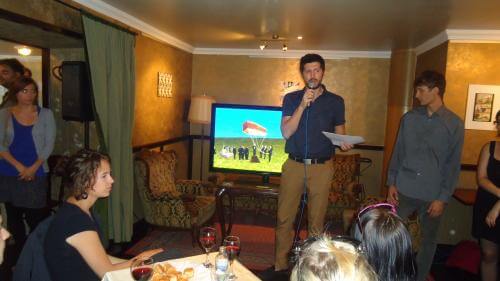 Vincze Nóra saját filmes munkáival rokonította kiállított rajzait, amelyek valóban egy-egy filmkockára emlékeztetik a nézőt-olvasót: az általa kiválasztott egyperces a képek mellett, önállóan olvasható. Remsei-Kovács Nóra inkább comic-stripnek nevezné a képeit, melyeken három nagy „dobozban” egymás mellé helyezte el a rajzokat, a klasszikus szövegbuborékokkal: bennük Örkény csattanós mondatai. Végül Popella Dóra mutatkozott be, aki a tévéképernyőn futó képsorokat alkotta meg Örkény Arról, hogy mi a groteszk? című műve alapján. Dóra egy digitális technika segítségével kétdimenziós fotókat helyezett egymás elé-mögé úgy, hogy az eredmény háromdimenziós képnek látszik. Így láthattuk például három dimenzióban azt a mulatságos jelenetet, „amint a sírásók két vastag kötélen fölbocsátják a koporsót”. A kisfilm egyébként négy másik videoval kiegészülve a Szatyor bárban látható majd.
