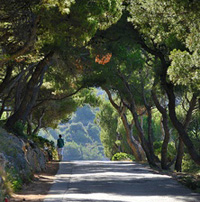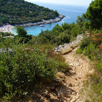 Lenn, a Križna lukában, a Feszület öblében csatlakoztam a sétányhoz. Ő úgy halad, ahogyan a part. Kígyózva, a szakadékai szélén. És következetesen délnek irányul. Csak agávék kapaszkodnak meredélyébe, mely lépten-nyomon szegélyzetté enyhül. Néhol lépcsőszalag tekerődzik le a rövid móló csücskébe. Alattam, szinte fényvízen horgonyzó bóják; fehérek, pirosak, sárgák, csónakok kikötéséhez. Mintha a látóhatár felett járnék, vagy legalábbis rajta. A sétány engem váró, már csaknem utolsó szakaszán, mindkét oldalon fák. Azoknak a törzse, amelyek a tengert takarják, ferdén nő a partsziklákból, lenyomva a déli szél lökéseitől, súlyától; tűlevélkoronájuk csúcsa azonban összefonódik a másik oldalon növőkével, és így együtt: árnyas ívekké.