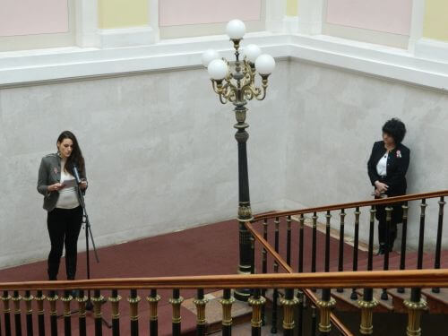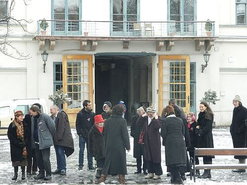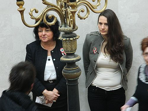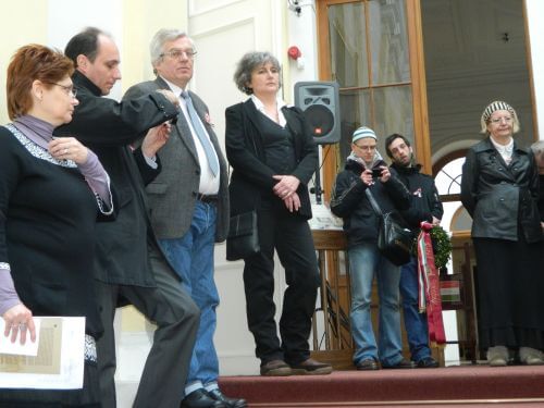 A Szépírók Társasága képviselőinek, Kéri Piroskának, Szilágyi Zsófiának és Mészáros Sándornak is elkélt a nagykabát, amíg másokkal együtt a díszterem előtti aulában várakoztak a műsor kezdetére.