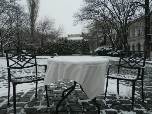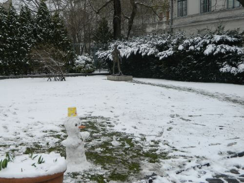 Dacolva a szél ellenséges támadásaival és a lelassult közlekedéssel, sikeresen átkeltünk ma Budáról Pestre, hogy megünnepeljük a szabadságharc 165. évfordulóját, még ha a tömeges megmozdulásokat "le is fújták" szinte mindenütt. A Pilvax környéke a belvárosban legalább olyan csendes és kihalt volt, mint a híd túloldalán a tabáni lankák. A Károlyi-palota kertjében is csak hófehér csendesség fogadta a koszorúzásra érkezőket, de a szervezők megnyugtattak: nem marad el az ünnepség.
