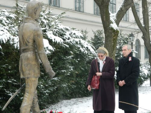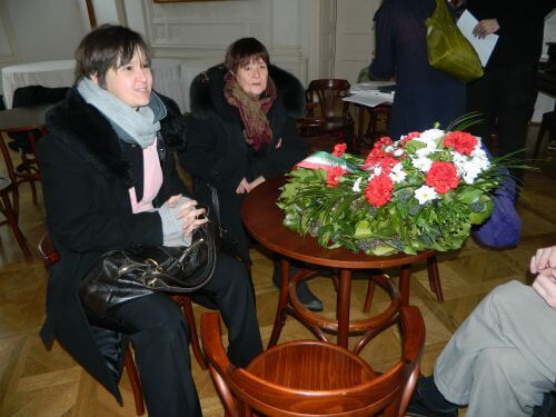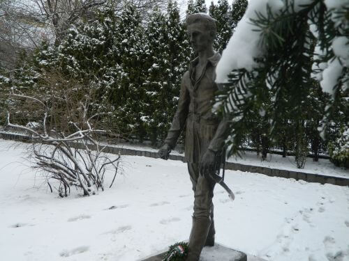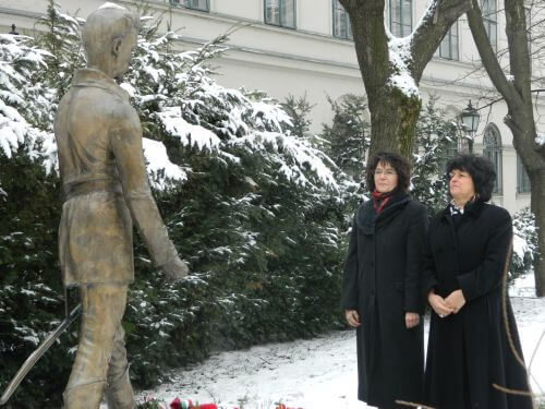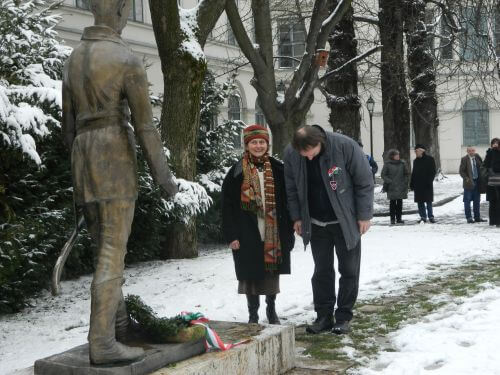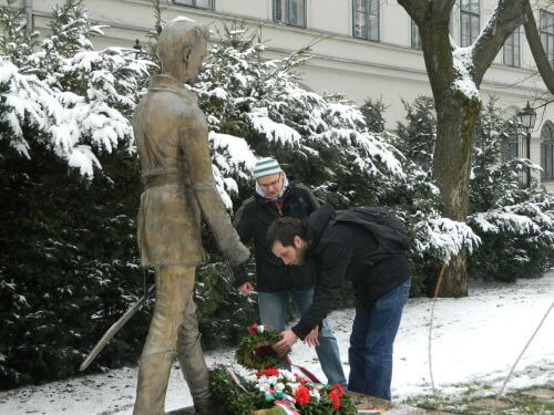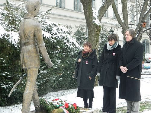 A beszédtől átfűtve vonultunk ki a fagyos hidegbe megkoszorúzni a költő szobrát. Elsőként a Széprók Társasága nevében koszorúzott Kéri Piroska, Szilágyi Zsófia és Mészáros Sándor.
