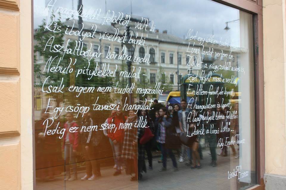 A következő helyszínen, a Piac utcán már láthatóak voltak a versekbe öltözött kirakatok. „A kirakaTransz című városi szintű program lényege, hogy a különböző intézmények és üzletek kirakataiban az eredeti kínálat mellett versek jelenjenek meg, s ezekben a hetekben a figyelem az ajándékba adott költeményekre irányuljon” – olvasható az Facebook-esemény leírásában.