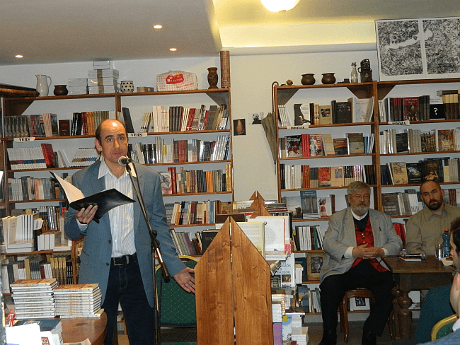 Farkas Wellmann Endre új verseskötetének bemutatója előtt a szervezők gondoskodtak a közönség jó kedélyéről – ha nem is római módra, de amolyan magyarosan lehetett lakomázni, némi pálinkának és a kolbászos falatkáknak köszönhetően. Ezután tértünk át a szellemi örömökre: A római disznó című kötetet bevezetésképp Szőcs Géza, a verseskönyv szerkesztője méltatta. A szerző tizedik könyvéről van szó, amelybe korábbi versei közül is beemelt néhányat. Szőcs Géza költői hasonlattal élt: olyan ez a kötet, mint a kőpatakok az Alpesek lábainál, a tavaszi olvadáskor megáradó és alázúduló vizek után. A hegyekből hömpölygő vizek fatörzset, csónakmaradványt, még kutyaházat vagy csontot is sodornak magukkal, s amikor visszahúzódnak, a tárgyak ott maradnak a kőmederben.