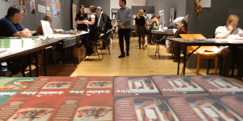 A folyóiratterem Irodalmi Jelen-perspektívából. A lapok számára fenntartott asztalok az egymásba nyíló szobákban kaptak helyet, kisebb labirintuson kellett végighaladni a látogatóknak, de ez senkit nem tartott vissza