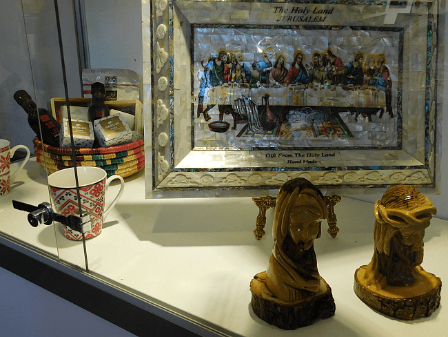 A palesztin standon a könyvek mellett egy vitrinben gyönyörű dísztárgyakat is megcsodálhattak az érdeklődők a Szentföld-kultúrkörből