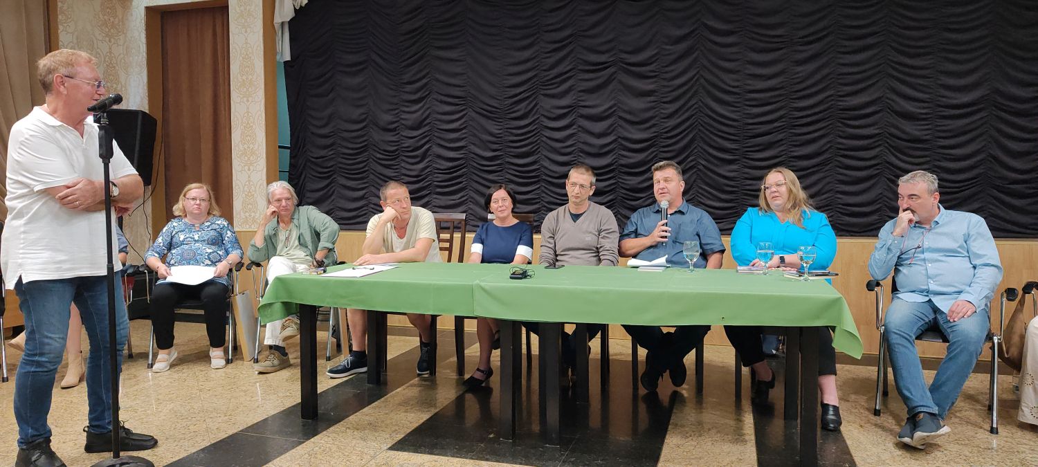 Az aradi Irodalmi Jelen-gálán 2025 szeptemberében: Böszörményi Zoltán, Lajtos Nóra, Vass Tibor, Orbán János Dénes, Varga Melinda, Muszka Sándor, Luzsicza István, Lőrincz P. Gabriella és Király Farkas