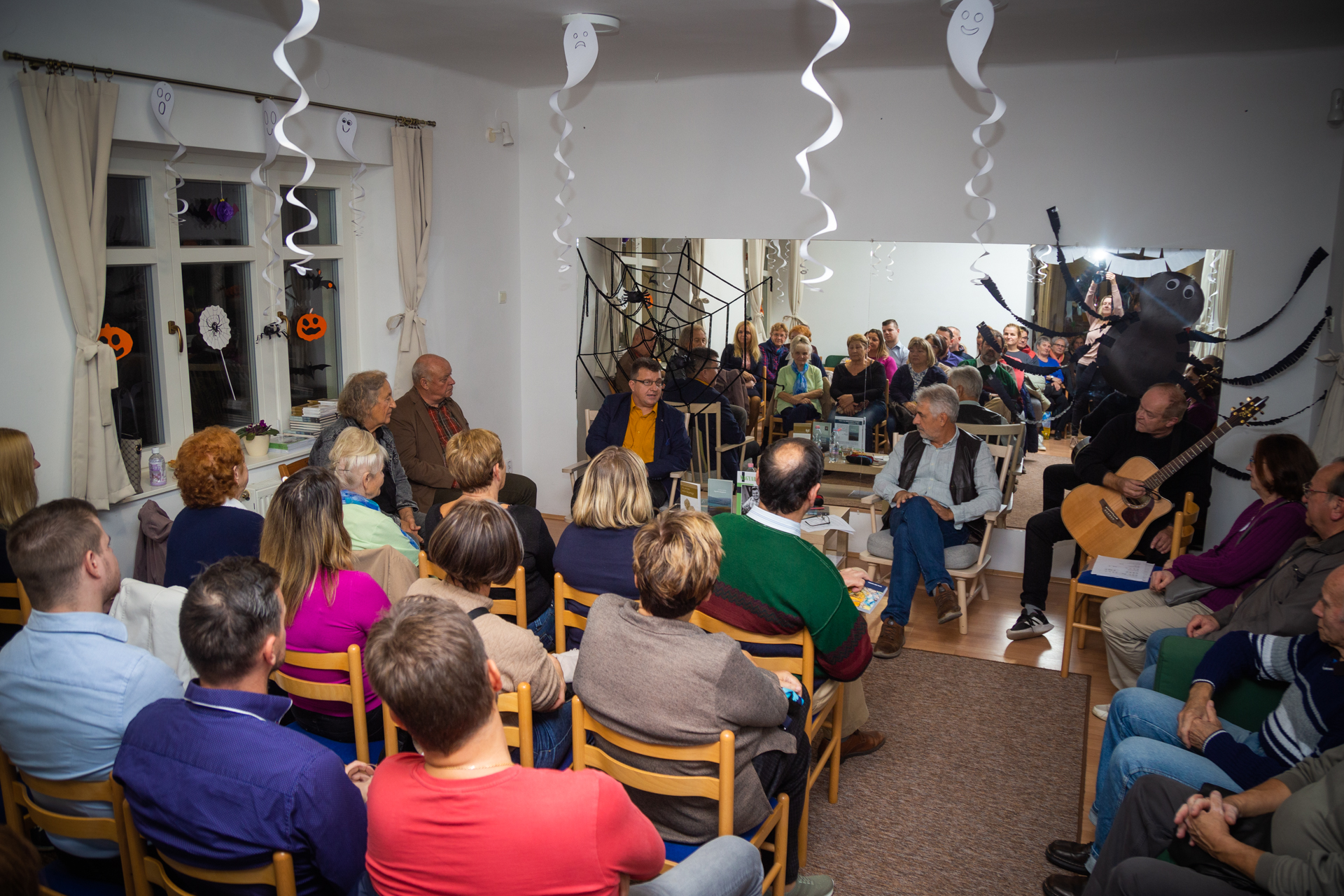 Az Ágain megtart bemutatója a zsúfolt kisalagi könyvtárban 2024 októberében, Oberczián Géza moderátorral és Borka Zsolt énekes-dalszerzővel
