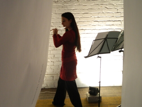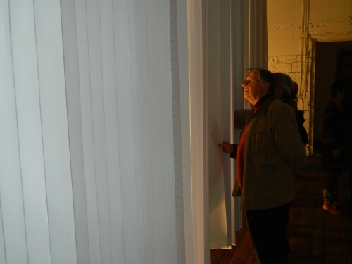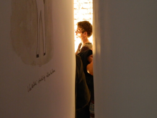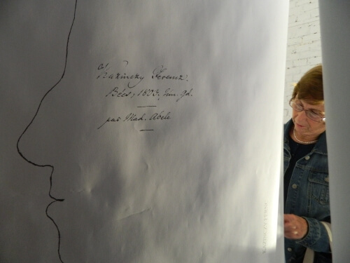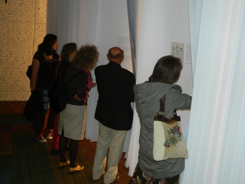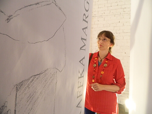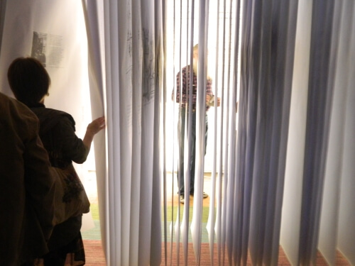 A FUGA hátsó termébe belépve, a reflektorokkal visszafogottan megvilágított félhomályban óriási szalagfüggöny látványa fogadja a megnyitóra érkezőket, közelebb lépve azonban kiderül, hogy a „függöny” lamellái valójában egy könyv önállóan lengő lapjai: a hófehér pauszok közt lapozgatva tárultak fel a magyar irodalom alkotóinak grafikái. A lapokra a rajzok és a hozzájuk tartozó idézetek digitális nyomatokként kerültek fel, a grafikák többsége eddig ismeretlen volt az olvasóközönségnek.