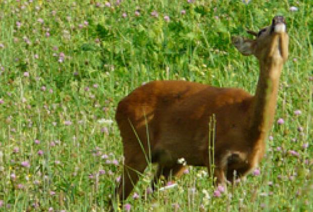 Gyönyörűen látszott a falu, szembe fordulva vele, balkéz felől a lemenő nap, jobbra őzikék. Ezek egy darabig feledtették is a kitörni készülő frászt, én pedig lelkesen fotóztam. Fura egy állat ez is. Ha nem mozogsz, akkor szerintem elhiszi, hogy nem vagy ott, úgyhogy igen fotogén. Utána kipróbáltuk, mennyire könnyű ráijeszteni – nagyon kellett neki integetni, hogy észrevegyen. Akkor viszont egy ugrással a bozótban termett.